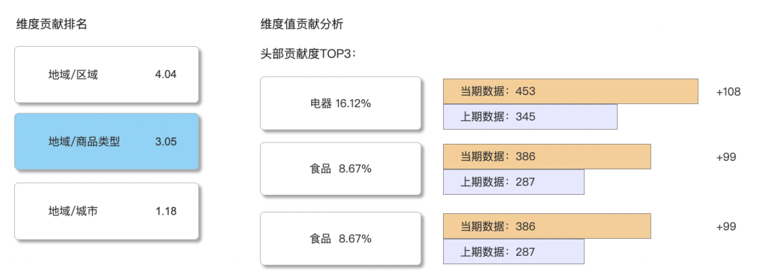 对执行指标归因分析时,系统会区分维度值计算指标波动情况,进一步计算出维度贡献度,并根据贡献度大小进行降序排序,让用户聚焦于头部更重要的影响因素。