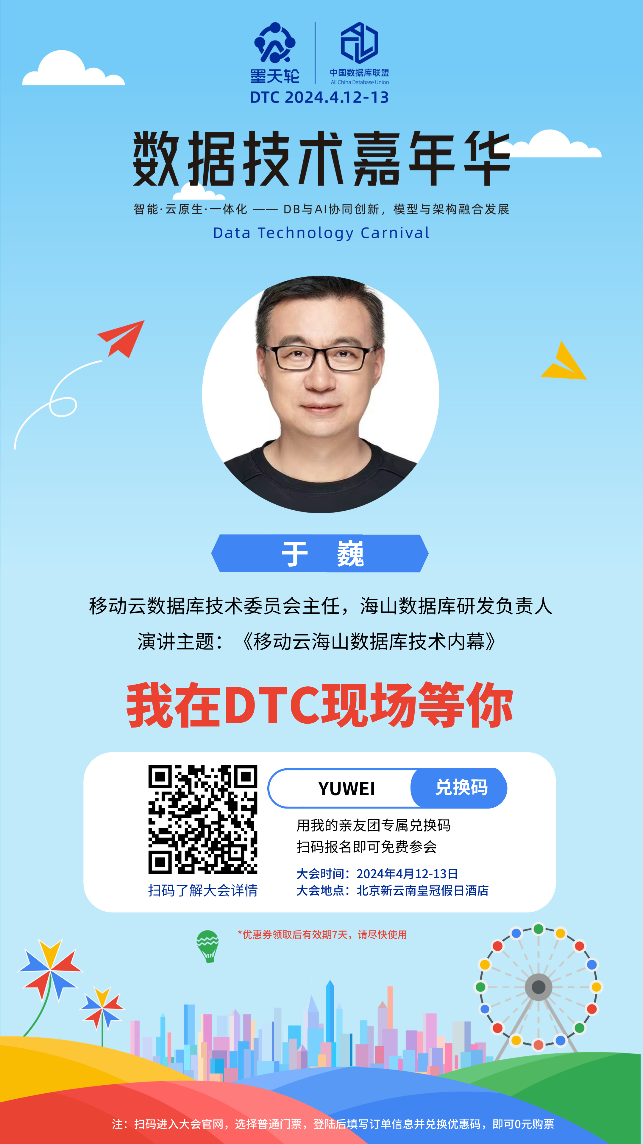 0元购票福利:👉进入数据技术嘉年华官网 ( https://www.modb.pro/dtc2024 ),购票时使用专属优惠码【YUWEI】即可免费购买普通门票一张,数量有限,先到先得!
