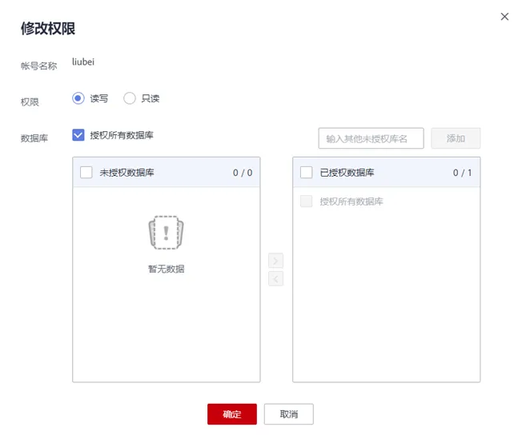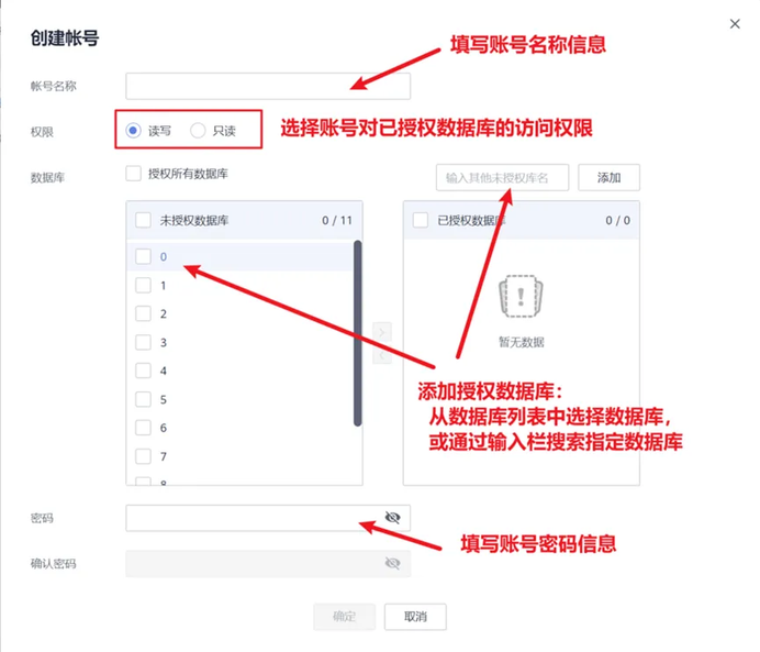 听上去是不是很复杂很难操作?其实 GaussDB(for Redis)的账号管理页面设计得很灵活直观,孔明可以通过点击“授权所有数据库”为刘备授权,又可以选择一个或者多个 DB 为关羽张飞授权,还能选择“未授权数据库”为赵云免除“桃园结义”DB 的只读权限,非常方便设置和后期管理。