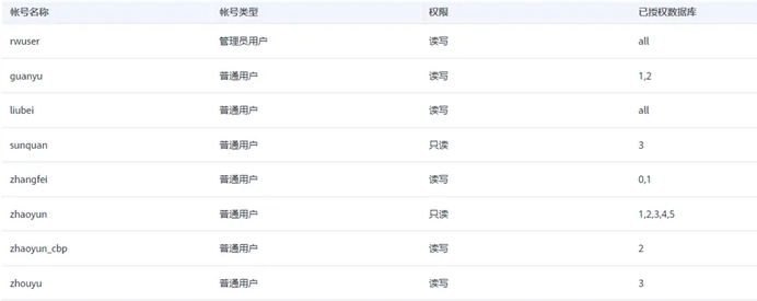 首先,他为刘备设置了所有 DB 的读写权限;为大将关羽和张飞设置了“桃园结义”DB0 和“华容道”DB1 和的读写权限,然后为秘书赵云设置了“长坂坡”DB2 的读写权限和其余 DB(除“桃园结义”DB0)的只读权限。至于吴国的合作伙伴,周瑜和黄盖被授予了“赤壁之战”DB3 的读写权限,而他们的主公孙权则被设置了“赤壁之战”DB3 的只读权限。