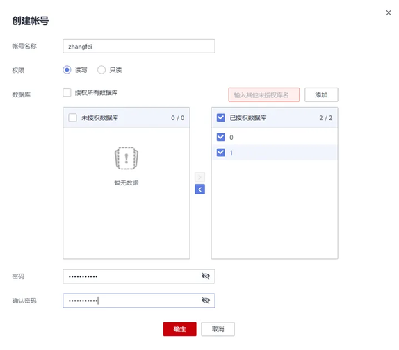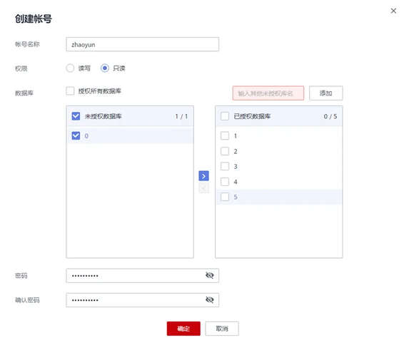 GaussDB(for Redis)的租户管理功能需要用户在控制台的账号管理页面建立账号,并为每个账号设置 DB 的只读/读写权限,操作非常直观方便。例如,下图创建了账号 test123,具备读写权限,且只能访问 DB1、DB2。