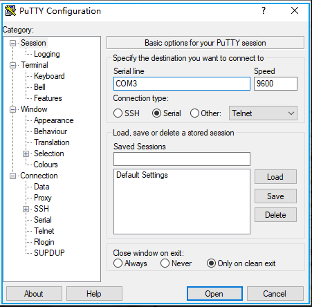 通过 Putty 连接串口,波特率设置为 9600