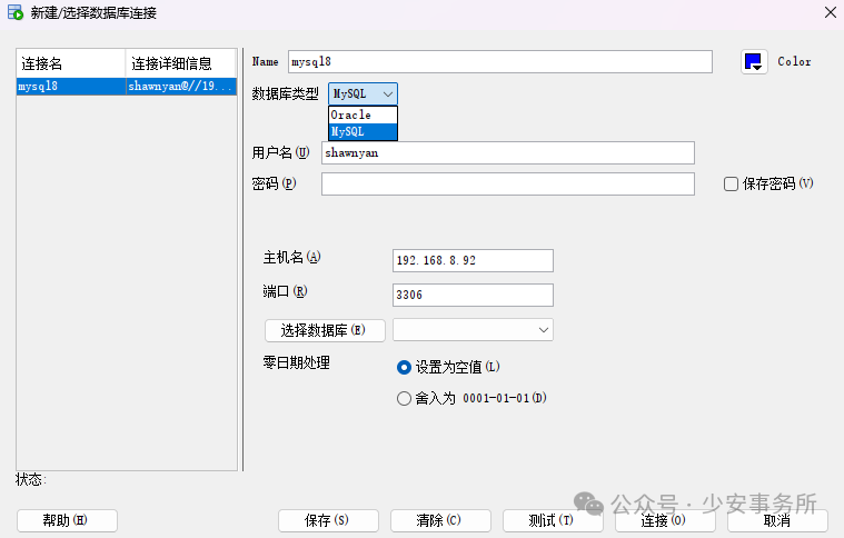 現在,我們可以新建 MySQL 的數據庫連接,在【數據庫類型】下拉菜單選擇【MySQL】即可。