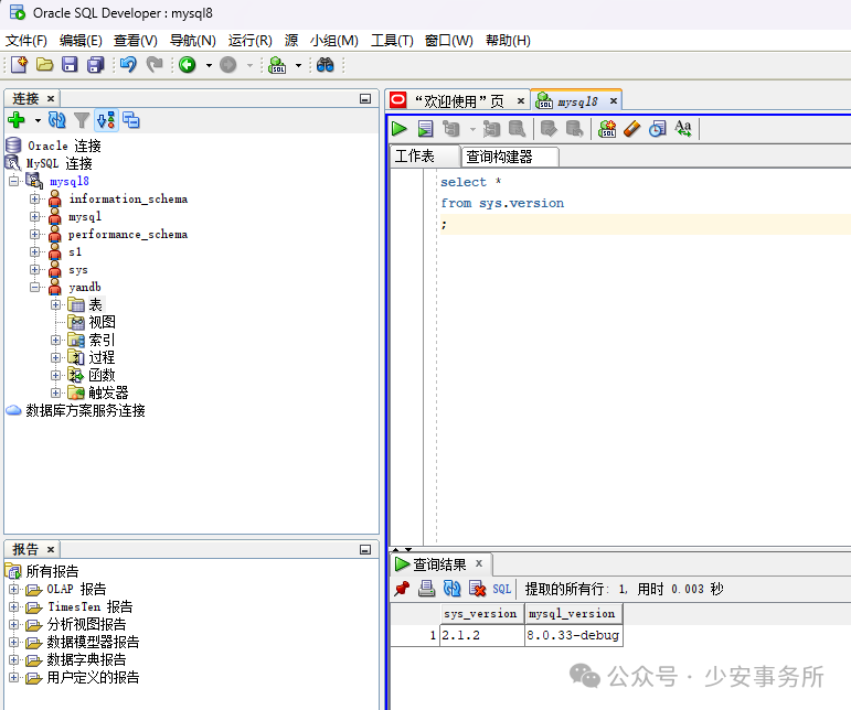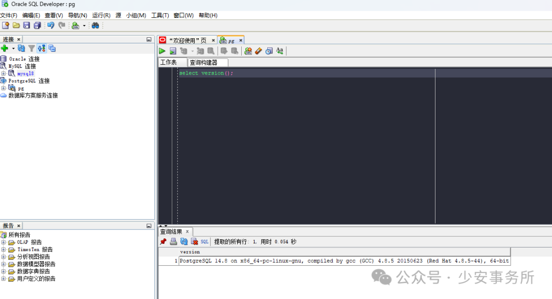 在查询窗口中,输入 SQL 语句,比如查詢數據庫版本信息。