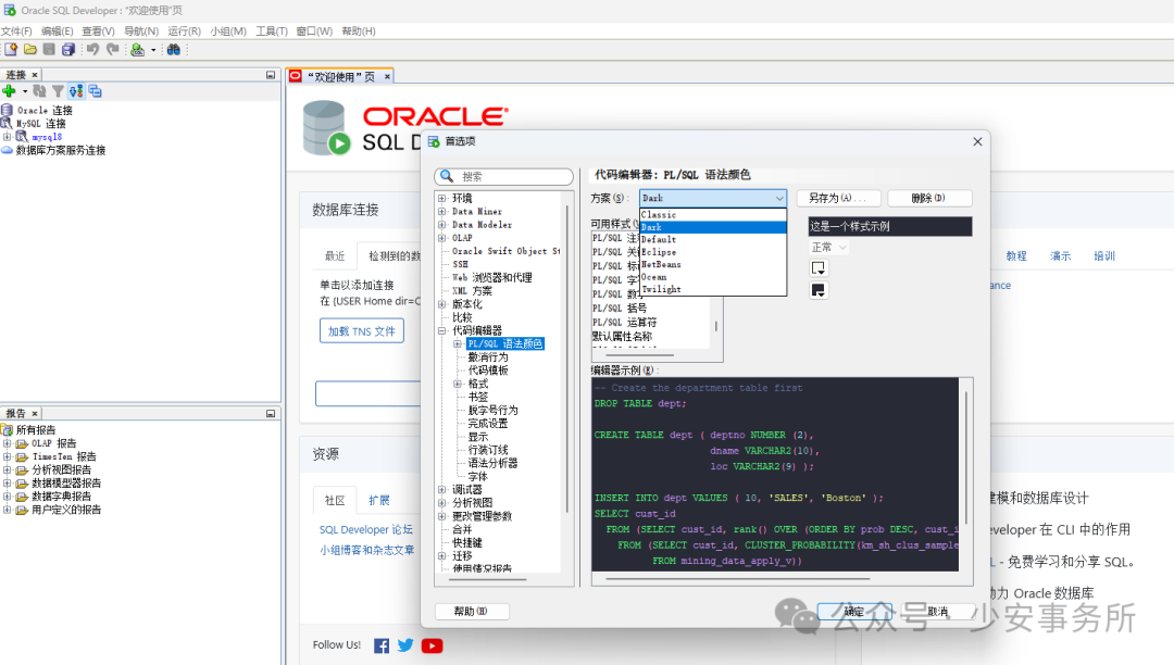 启动 SQL Developer,点击菜單欄【工具】-》【首選項】-》【代码编辑器】-》【PL/SQL 语法颜色】,选择【Dark】方案,【确定】。