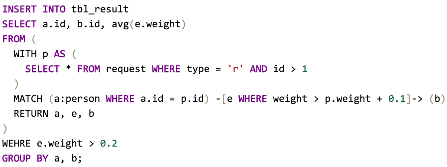 TuGraph Analytics的SQL+GQL融合语法典型形式为“SELECT-FROM-WITH-MATCH-RETURN”结构,通过GQL语法的“MATCH-RETURN”语法单元,为SQL处理提供数据子视图,方便传统数据分析师对数据的进一步处理。