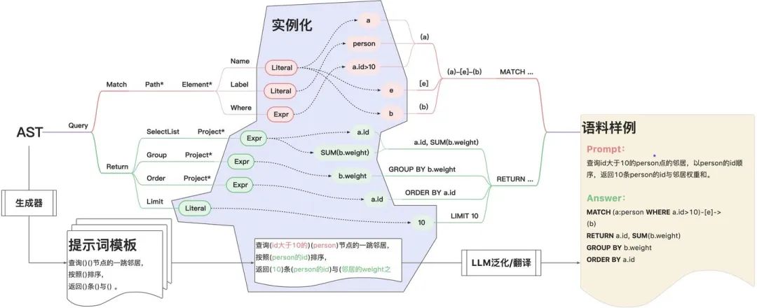 众所周知,要实现模型微调,构建语料是第一步,也是最关键的一步,语料的质量和丰富度会直接决定微调模型的预测效果。但是前面提到,由于图查询语言标准的不够成熟,想要获取现有的GQL语料是一件很困难的事情。另外,SQL+GQL语法更是TuGraph的“独创”,业务语料的丰富度更低。这种情况下,我们只能“自力更生”想办法创造语料,于是就有了“语法制导的语料生成策略”。