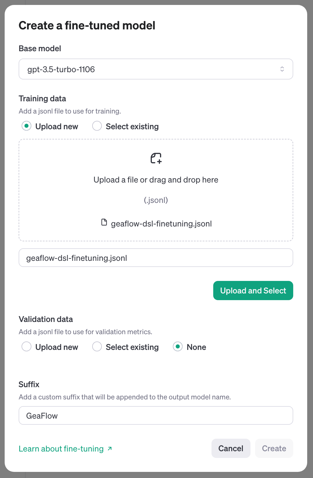 进入OpenAI模型微调页面[16],上传格式化后的语料文件(一般以.jsonl结尾),设置模型前缀,创建微调任务。