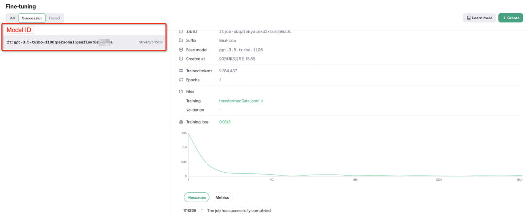 模型微调完成后,可以看到最终的模型ID,形如:ft:gpt-3.5-turbo-1106:personal:<Suffix>:<Id>