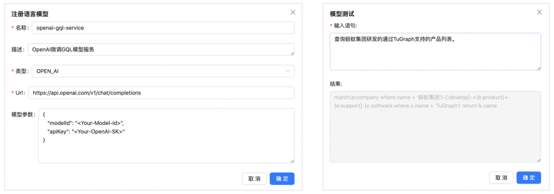 登录Console后,切换到“系统模式”,进入“系统管理-模型管理”注册模型服务,模型类型可选择OPEN_AI或LOCAL,分别对应上述的OpenAI微调模型和本地部署模型。注册完成后,可以做简单的可用性测试。