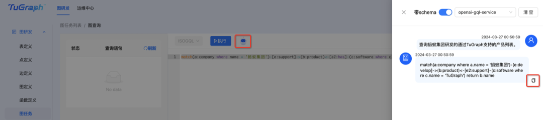 切换到“租户模式”,选择一个图查询任务,进入查询页面。点击“执行”按钮右侧的机器人图标,即可开启对话。对话回答的GQL语句可以点击复制按钮一键执行。