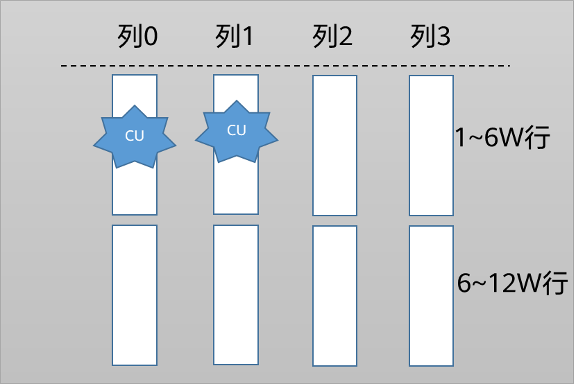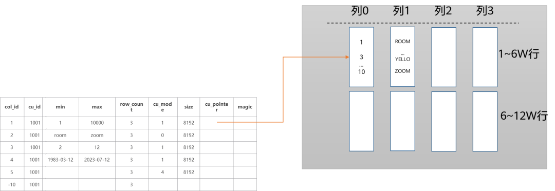 列存储引擎的最小存储单位是CU(Compression Unit, 压缩单元):一个CU是由表中某一列的一部分数据组成的压缩数据块, 通过(cu_id,col_id)标识一个CU。