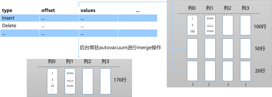 HStore利用delta表存储update/delete/insert等操作信息。之后依赖后台常驻autovacuum来做merge操作将数据写入主表。