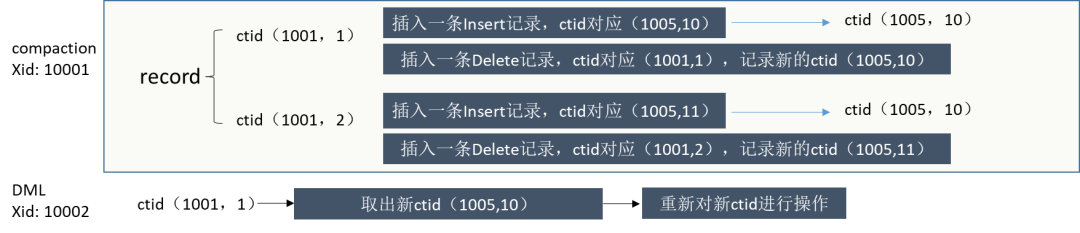 和正常的delta merge不同在于,小CU被标记删除后新插入delta表的记录会申请新的ctid,因为ctid是变化的,所以该操作和DML操作存在冲突。当DML操作时遇到小CU合并,使用等待重试的方式处理;当compact操作时遇到DML冲突时直接跳过即可,原因就是删除和更新操作还是会将数据标记删除,因此可以直接放弃合并此条数据。