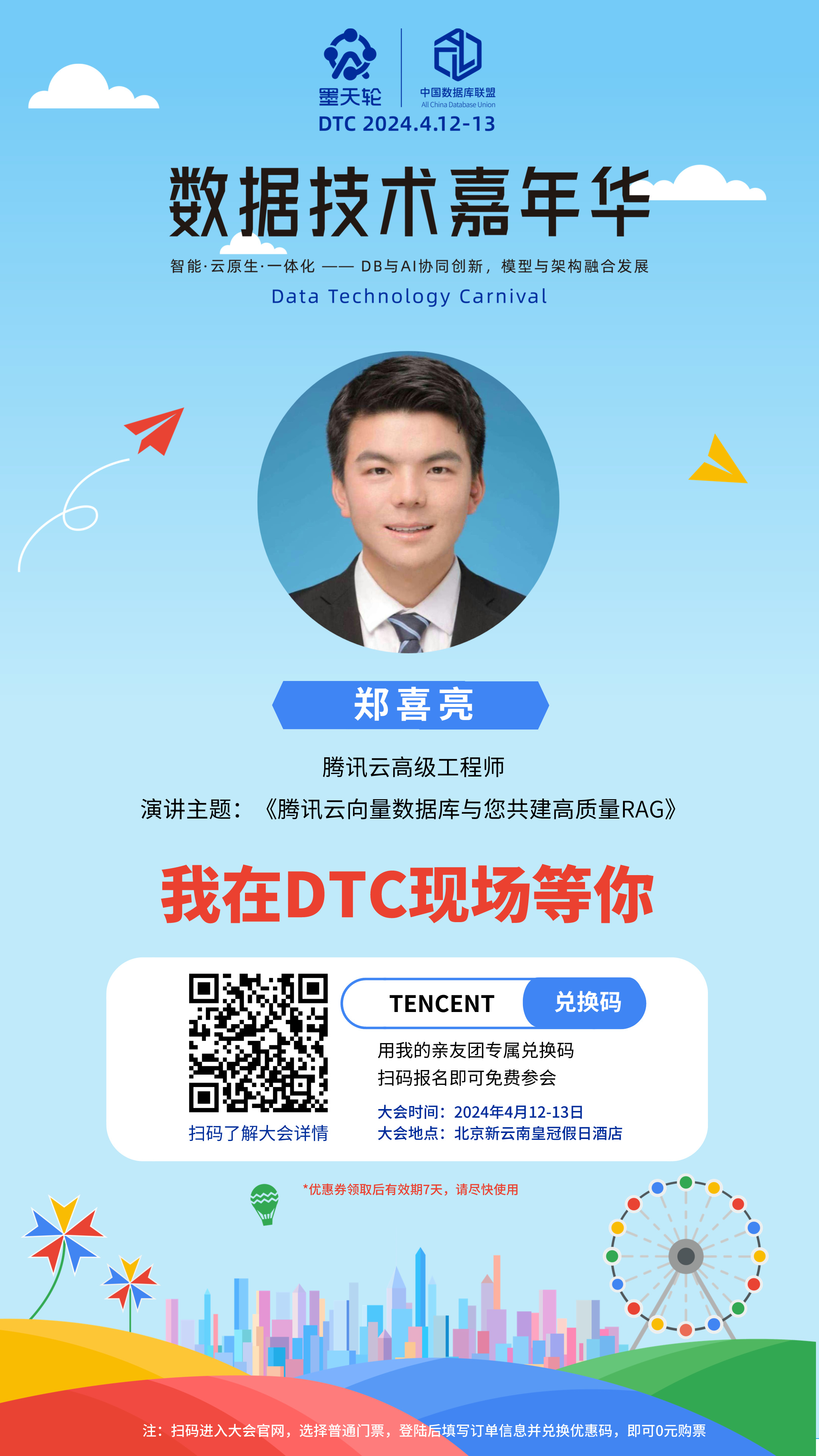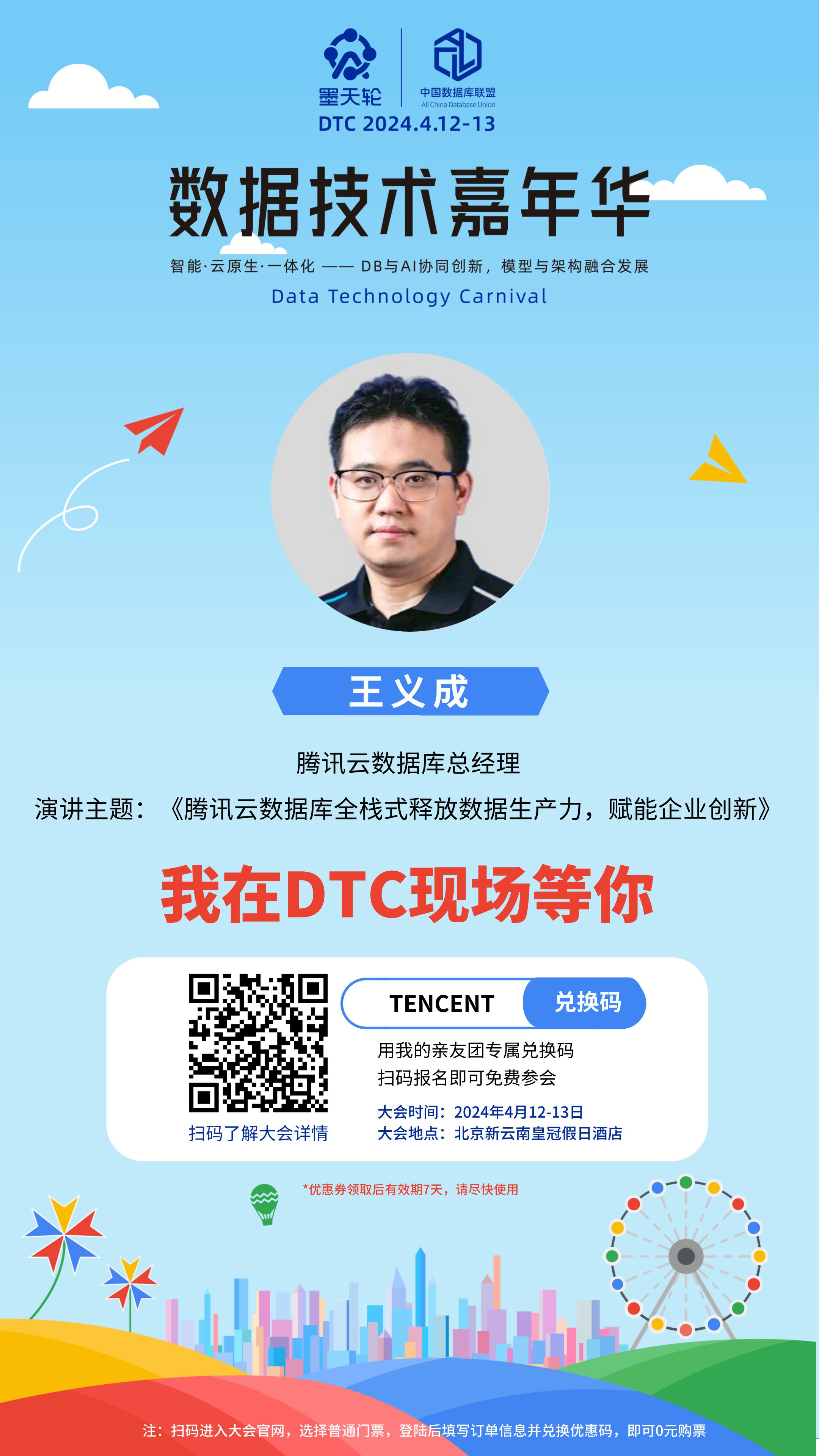 0元购票福利:👉进入数据技术嘉年华官网 ( https://www.modb.pro/dtc2024 ),购票时使用专属优惠码【TENCENT】即可免费购买普通门票一张,数量有限,先到先得!
