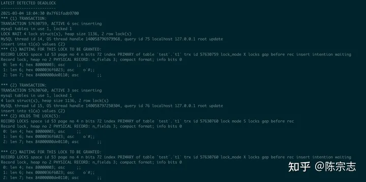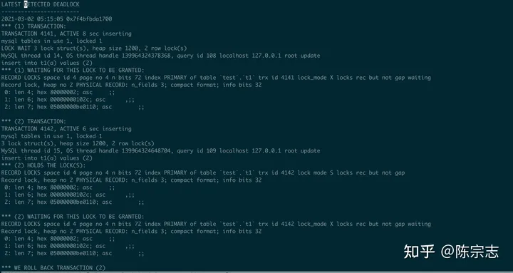 在session1 执行 rollback 以后, session2/session3 获得了s record lock, 在insert commit 时候发现死锁, rollback 其中一个事务, 另外一个提交, 死锁信息如下