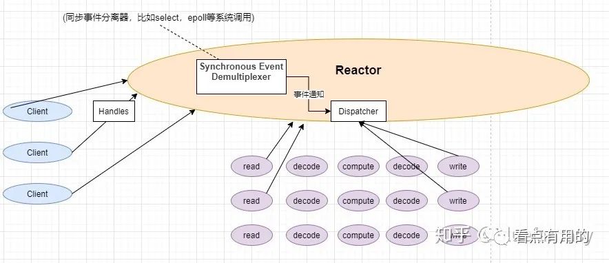 典型的事件驱动架构就是网络I/O中的Reactor模式,如下图所示。