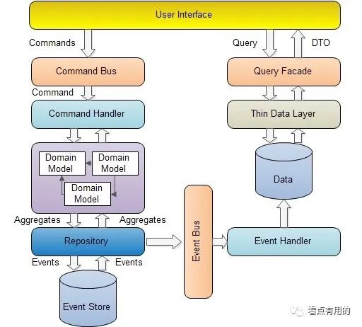 在CQRS中,命令是系统中引起状态变化的活动,通过是一种命令语气;事件则描述了某件事情的发生,通常是命令的结果。如上图,当一个命令下发时,通过命令处理器,聚合成对不同与模型的处理,在存入数据库的同时,通过事件总线同步到事件查询库,供事件查询处理器调用。