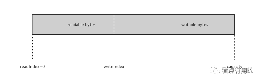 当执行ByteBuf的writeXxx()方法的时候,主要操作的是writeIndex指针,此时每写一个字节,writeIndex指针会向右移动一位,直到等于capacity,如果仍有待写入内容,则会触发ByteBuf的扩容机制。此时writable bytes区域会缩小以至消失,readable bytes区域会逐渐扩大至capacity的位置,表示ByteBuf的数据写入完毕。其示意图如下。