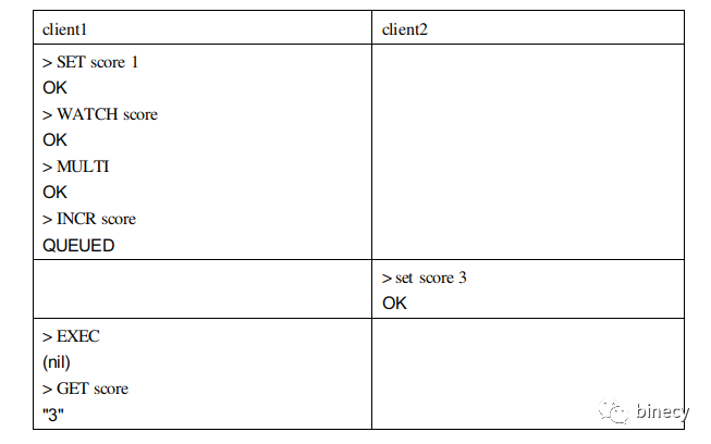可以看到,在执行EXEC命令前如果WATCH的键被修改,则EXEC命令不会执行事务,因此WATCH常用于实现乐观锁。