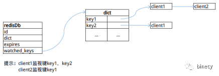 【1】将客户端添加到redisDb.watched_keys字典中该Redis键对应的客户端列表中。