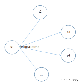 在分布式系统中,某个节点修改数据后不仅要删除当前节点的本地缓存,还需要发送请求给集群中的其他节点,要求它们删除该数据的本地缓存,如下图所示。如果分布式系统中节点很多,那么该操作会造成不少性能损耗。