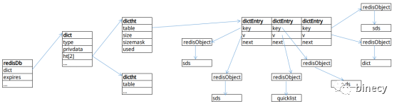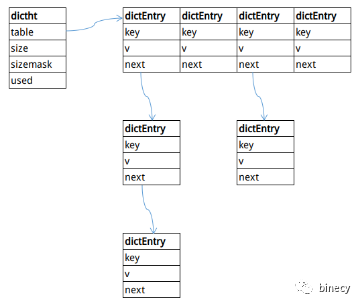 next:下一个键值对指针。可见Redis字典使用链表法解决Hash冲突的问题。
