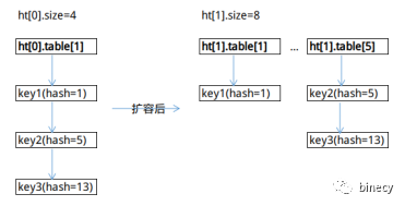 因此,假如ht[0].size为n,ht[1].size为2×n,对于ht[0]上的元素,ht[0].table[k]的数据,要不迁移到ht[1].table[k],要不迁移到ht[1].table[k+n]。这样可以将ht[0].table中一个索引位的数据拆分到ht[1]的两个索引位上。
