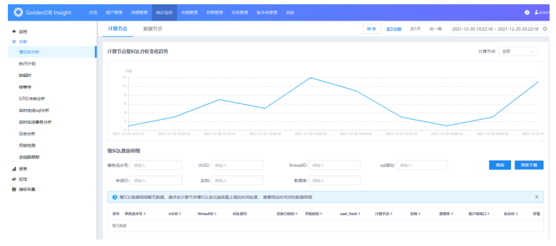 通过对SQL语句的统计,可查看不同实例、连接实例、分片根据不同指标的SQL语句执行时间并将其与历史比对。