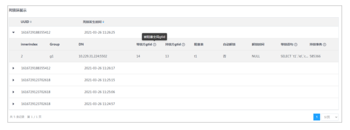 4.选择不同的实例、相应的连接实例,从而直观的展示一定时间范围内活跃GTID变化趋势及GTID申请、释放平均耗时变化趋势。默认选择全部。
