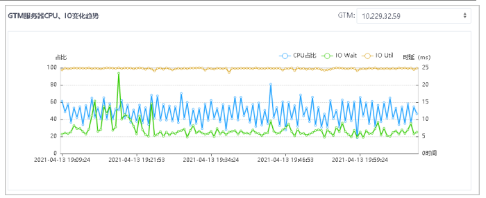 7.在GTM服务器CPU、IO变化趋势中,通过选择右上角不同的GTM服务器,可展示其CPI、IO变化趋势。