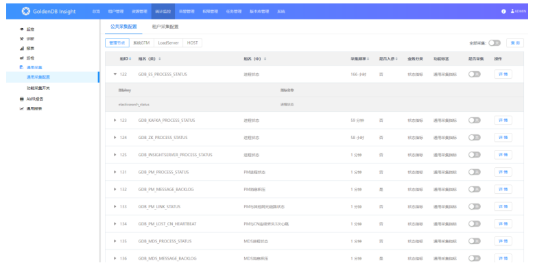 该页面展示的管理节点,系统GTM,loadServer,和HOST下的各个指标信息,同时可对指标的采集进行开关和配置采集频率。