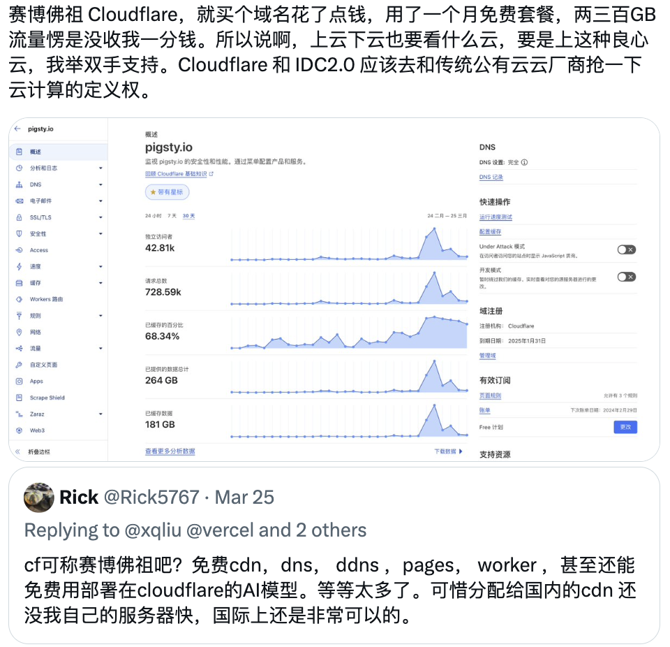 另一种 ToC 的典型场景是学生和个人站长。在以前,拿个 2C 2G 3M带宽的小虚拟机弄个网站还是挺不错的 —— 但是自从有了赛博佛祖 Cloudflare,别说 99 块钱的云服务器了,9块9 都不香了 —— 再便宜能便宜过免费吗? —— 更何况用 CF 建站的体验比云服务器要好太多了 —— 都不说各种Free Plan,就凭流量免费这一点,就足以让“送的几兆带宽”都统统变垃圾……