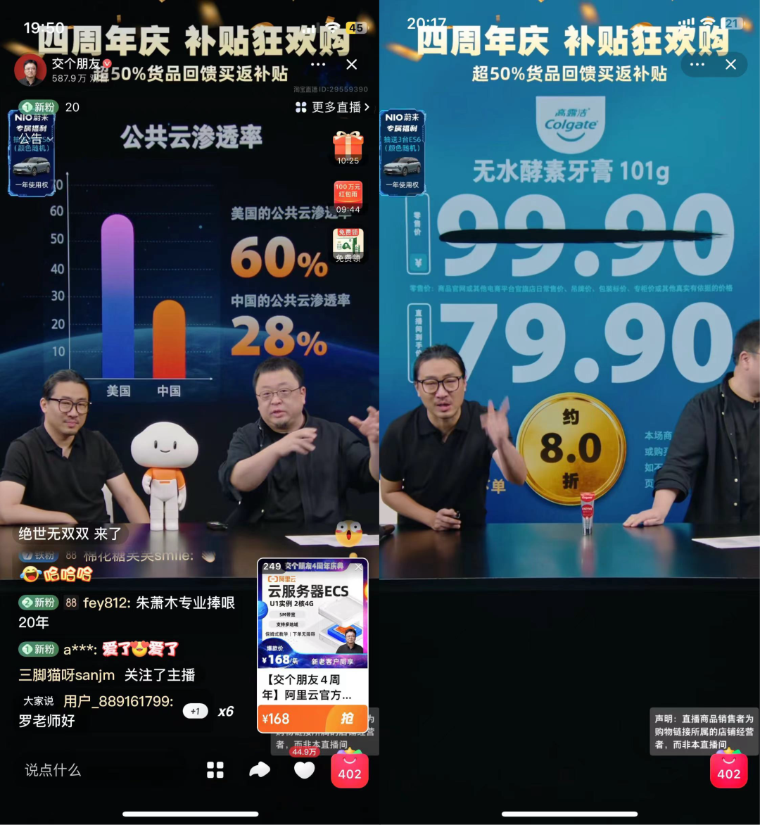 老罗曾是一位很牛B的数码产品经理,算与 IT 行业沾边。但隔行如隔山,老罗卖云,就好像同时卖肉菜蛋奶和 Office 光盘的路边摊。事实也是如此 —— 老罗直播间先铺垫卖了半个小时的扫地机器人,接着姗姗来迟的老罗照本宣科念台词卖了四十分钟”云计算“ —— 然后马不停蹄地卖起了 高露洁无水酵素牙膏 —— 留下在云计算与牙膏间迷惑凌乱的观众。