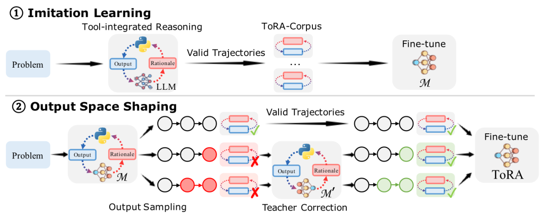 ToRA的训练过程包括两个关键步骤:首先,通过模仿学习(imitation learning)来训练模型,使其能够生成与工具交互的推理轨迹;其次,通过输出空间塑形(output space shaping)来进一步优化模型的推理行为。这一过程涉及到从高质量的注释中学习,并在模型生成的输出中引入多样性,同时纠正错误的工具使用行为。