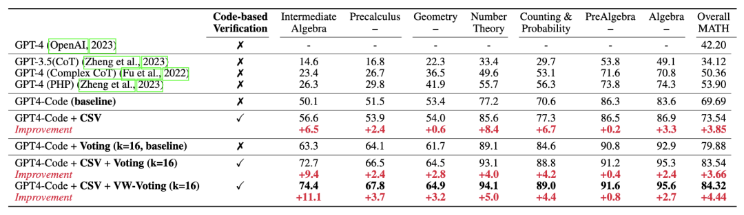 此外,研究者还发现验证结果的状态可以指示解决方案的可信度,这有助于提高多数投票法的有效性。通过结合GPT-4 Code Interpreter和CSV,研究者在MATH数据集上实现了令人印象深刻的零样本准确率提升,从53.9%提高到84.3%。