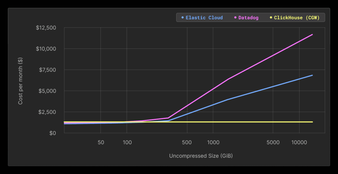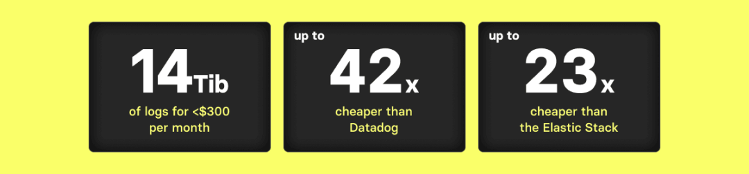 在我们的基准测试中,通过多达14倍的压缩比,这个集群(允许高达1TiB的压缩数据)潜在地可以存储高达14TiB的未压缩日志数据。用户可以利用这些多余的容量进一步增加存储密度,如果查询性能不是关键问题,也可以简单地将其用于延长数据保留时间。我们展示了与其他解决方案相比的巨大节省,例如Elastic和Datadog,对于相同的数据量,它们的成本是原来的23倍到42倍。