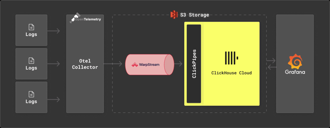 虽然ClickHouse可以作为一个独立的日志存储引擎使用,但我们意识到用户通常更喜欢一种架构,即数据在插入ClickHouse之前首先在Kafka中进行缓冲。这提供了许多好处,主要是在吸收流量峰值的同时保持对ClickHouse的插入负载恒定,并允许将数据转发到其他下游系统。在我们提出的架构中,希望尽可能降低成本和操作,我们考虑了一个Kafka实现,也将存储和计算分开:WarpStream。我们将其与我们的标准建议一起使用,即用于日志收集的OTEL和用于可视化的Grafana。