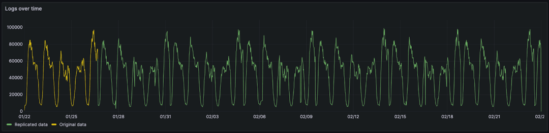 我们已复制了这些数据,以涵盖一个月的时间,以便我们可以预测更典型的保留间隔。虽然这会导致固有数据模式的重复,但这被认为对我们的测试足够,并且类似于日志记录用例中看到的典型的每周周期性。