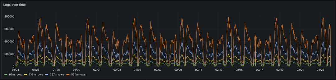 本月的数据包括 6600 万行和 20GiB 的原始 CSV/log 数据。为了复制这些数据以进行更大规模的测试并保持其数据属性,我们使用了一种简单的技术。与其简单地复制数据,我们将现有数据与一个顺序已被随机化的副本进行合并。这涉及一个简单的脚本,逐行迭代遍历两个授权文件和随机化文件。来自随机化文件和授权文件的行被复制到目标文件中。两者的“配对行”都被分配了授权文件中的日期。这确保了上面显示的周期模式得以保留。这与简单地复制行形成对比,简单地复制行会导致重复的行相邻放置。这会有利于压缩并提供不公平的比较 - 随着数据的复制而恶化。下面,我们展示了使用上述技术复制的相同数据,分别为 1.33 亿、5.34 亿和 10 亿行日志。
