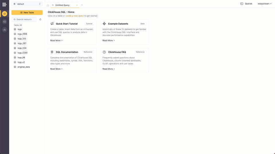 用于我们基准测试的所有文件都可在S3存储桶s3://datasets-documentation/http_logs/中下载,以允许用户复制测试。这些数据以CSV格式提供方便。对于希望将这些数据加载到代表性环境中的用户,我们提供了以下实用程序。这将数据推送到WarpStream实例,如下所示。