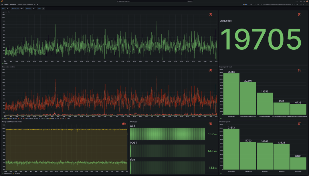 | simple count over time | count by status over time | unique count of remote_addr | request_path by count | remote_addr by count | average and 99th percentile response time transferred over time | total bytes transferred by request_type | |
