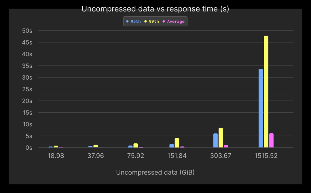 更高的百分位数可以归因于冷查询,在我们的基准测试中没有预热时间。如下图所示,这些较慢的查询也与我们最后的下钻行为相关联,其中我们将数据可视化超过30天。这种访问类型通常不频繁,SRE更专注于较短的时间范围。尽管如此,即使在我们的最大测试中(1.5TiB),平均性能也保持在6秒以下。