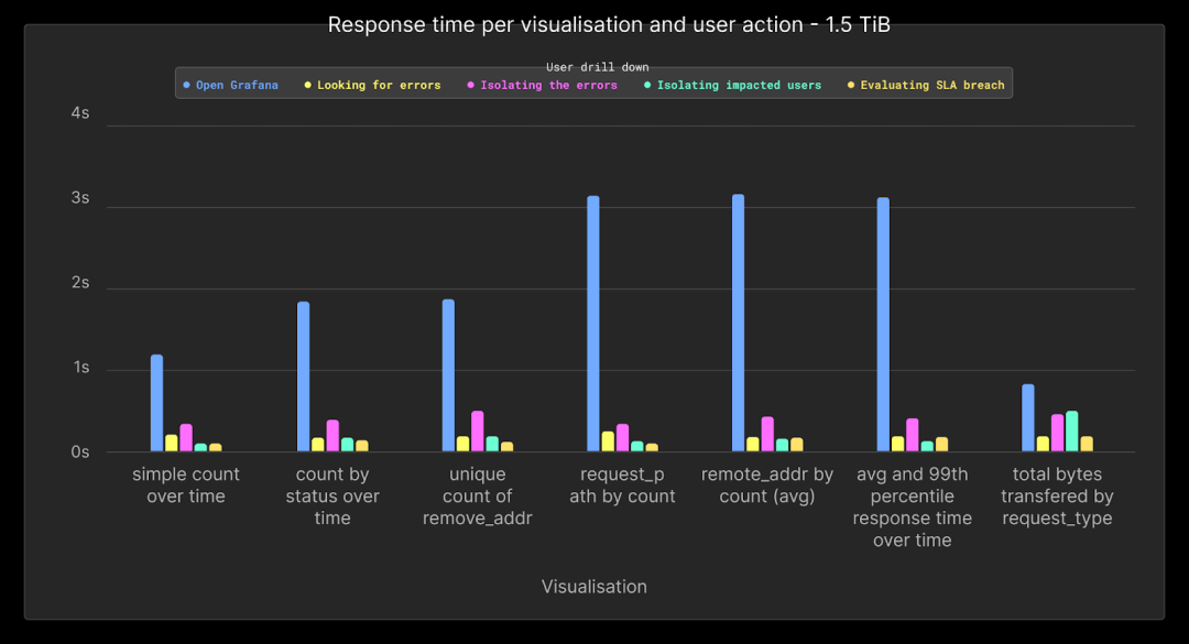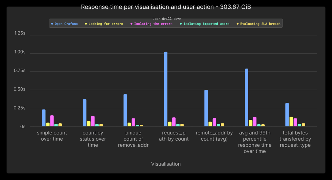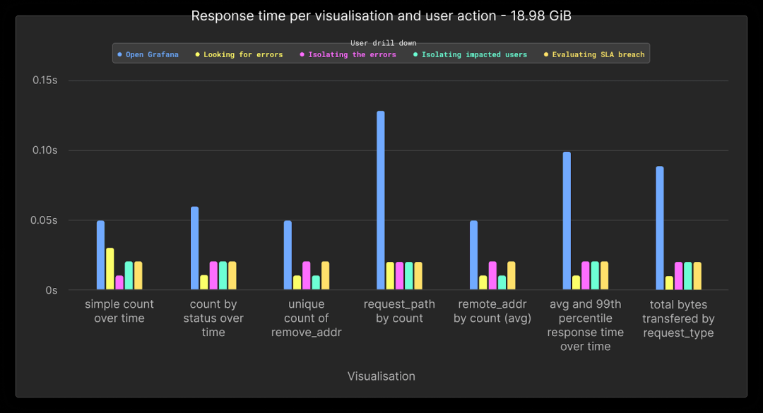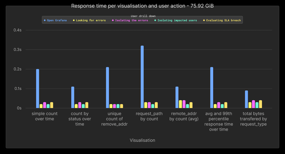 尽管这些行为是人为的,没有特定的事件,但它们旨在模拟SRE使用集中式日志记录解决方案的典型使用模式。可以在这里找到完整的结果查询。(https://github.com/ClickHouse/simple-logging-benchmark/tree/main/queries)