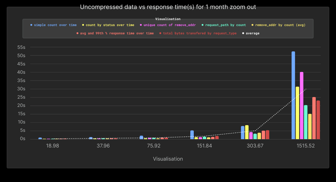 敏锐的读者会注意到,我们上面没有包含最后一组查询的性能,这些查询与用户“缩小”以覆盖整个月份相关联。这些是最昂贵的查询,其时间会扭曲上面的图表。因此,我们在下面单独呈现这些查询的结果。