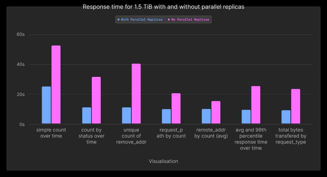 如图所示,启用并行副本将我们的查询平均加速了2.5倍。这确保了我们的查询最多在24秒内响应,大多数在10秒内完成。请注意,根据我们的测试,只有当需要聚合大量行时,并行副本才能提供好处。对于其他较小的数据集,分发的成本超过了好处。在ClickHouse的未来版本中,我们计划使此功能的使用更加自动化,而不是依赖用户根据数据量手动应用适当的设置。