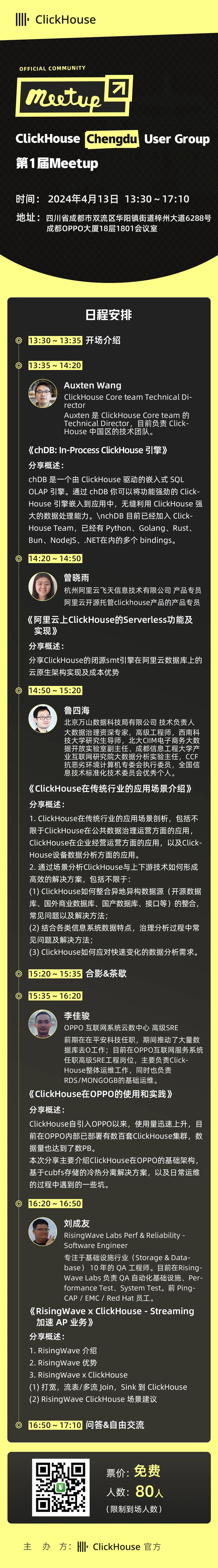好消息:ClickHouse Chengdu User Group第1届 Meetup 已经开放报名了,将于2024年4月13日在成都市双流区华阳镇街道梓州大道6288号成都OPPO大厦18层1801会议室举行,扫码免费报名
