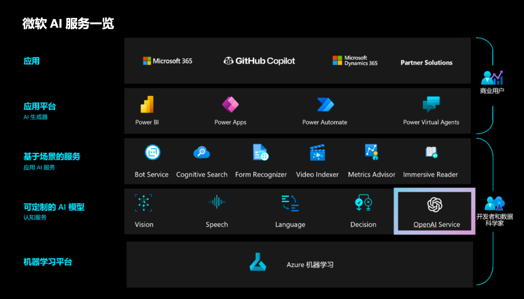 Azure AI 服务包括了 Azure 机器学习平台、认知服务和应用 AI 服务。其中,Azure 认知服务有五大支柱,分别是视觉、语音、语言、决策和 Azure OpenAI 服务。