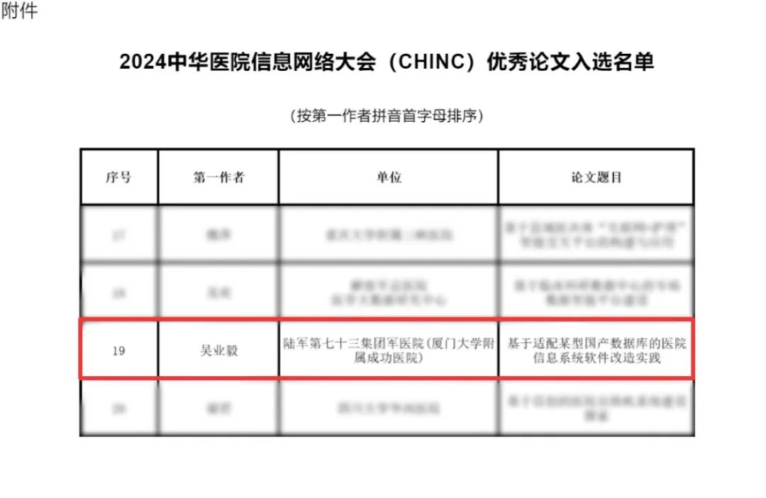 近日,《中国数字医学》杂志社有限公司发布“2024中华医院信息网络大会(CHINC)优秀论文”入选名单,陆军第七十三集团军医院(厦门大学附属成功医院)《基于适配某型国产数据库的医院信息系统软件改造实践》上榜。该项目基于达梦数据库,顺利完成医院包括核心系统在内的全部业务系统和办公系统的数据库国产化改造。在达梦数据库的支撑下,厦门大学附属成功医院以最少的投入和最快的速度,在全国三甲医院率先实现了国产化信息系统的全场景应用,成功完成了网信转型。