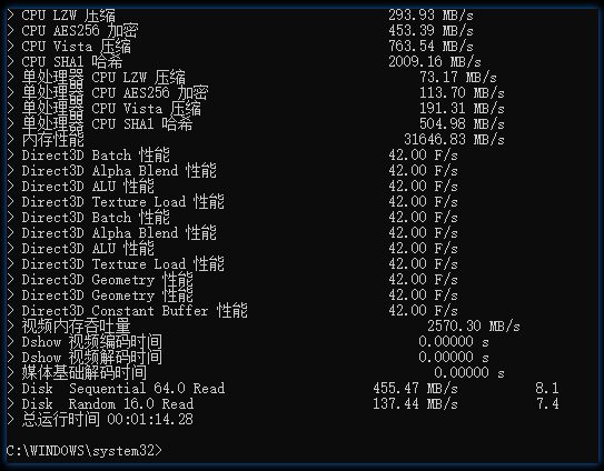winsat 会测试 CPU 执行压缩任务时的吞吐率,以及内存、图形、硬盘的性能。一般情况 CPU 、内存、图形的性能不会无缘无故地变慢,但硬盘性能有可能会随着时间的推移开始越用越慢。